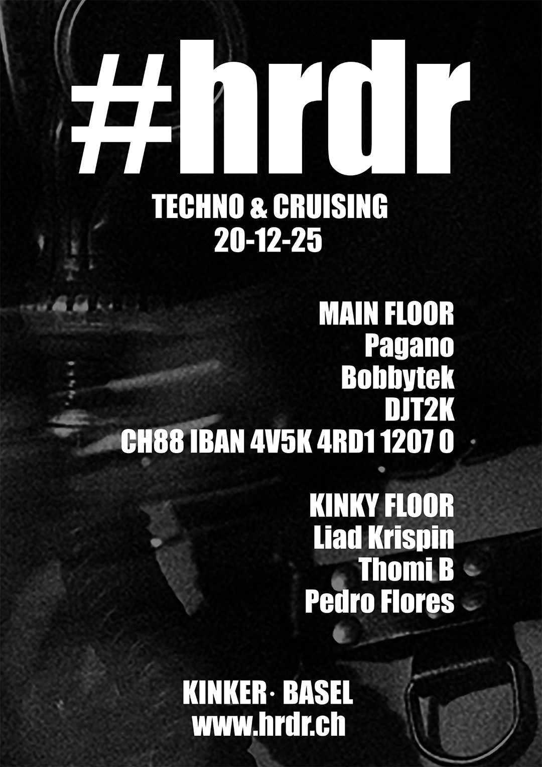 #HRDR – die legendäre kinky Party in Basel & Zürich, Schweiz. Die DJs spielen reinen Techno. Kinky Playrooms stehen für alles zur Verfügung, worauf du Lust hast – solange es im gegenseitigen Einverständnis geschieht. #hrdr heißt alle Geschlechter und alle sexuellen Orientierungen willkommen. Es gibt keinen Dresscode, allerdings fühlst du dich in Leder, Gummi oder sportlichem Outfit – oder nackt – wahrscheinlich wohler.